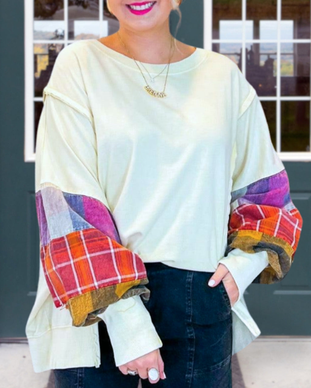 Plaid Patchwork Sleeve Pullover