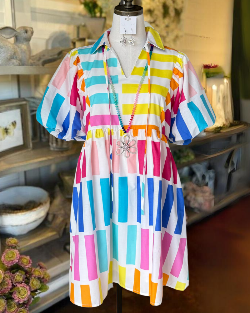 Expertly crafted with color and craftsmanship, this puff-sleeved dress is crafted from satin fabric in an intricate rainbow check pattern.