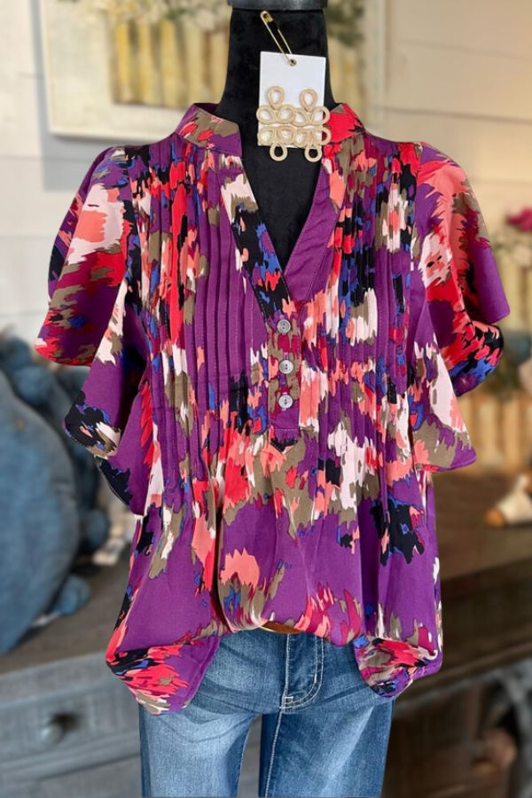 This top features a full purple pattern print, V-neck, petal sleeves, loose fit, adjustable buttons at the neckline, and pleated front design.