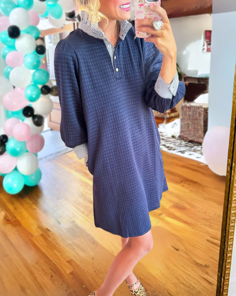 This expertly designed half-open collar mini dress features elegant quilting combined with crisp striped trim for a polished finish.