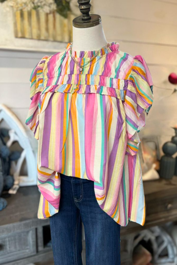 This top features a mock neckline with ruffled detailing, a shirred elastic yoke, and fluttery short sleeves. The woven fabric showcases a colorful stripe pattern, and the back button closure with keyhole adds a stylish touch.