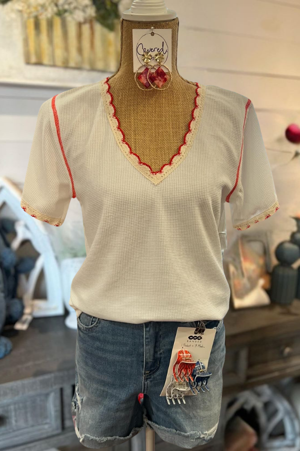 This top features a lovely pink wavy lace trim, paired with a breathable and comfortable waffle knit fabric. With a loose cut design, it's perfect for a relaxing summer.