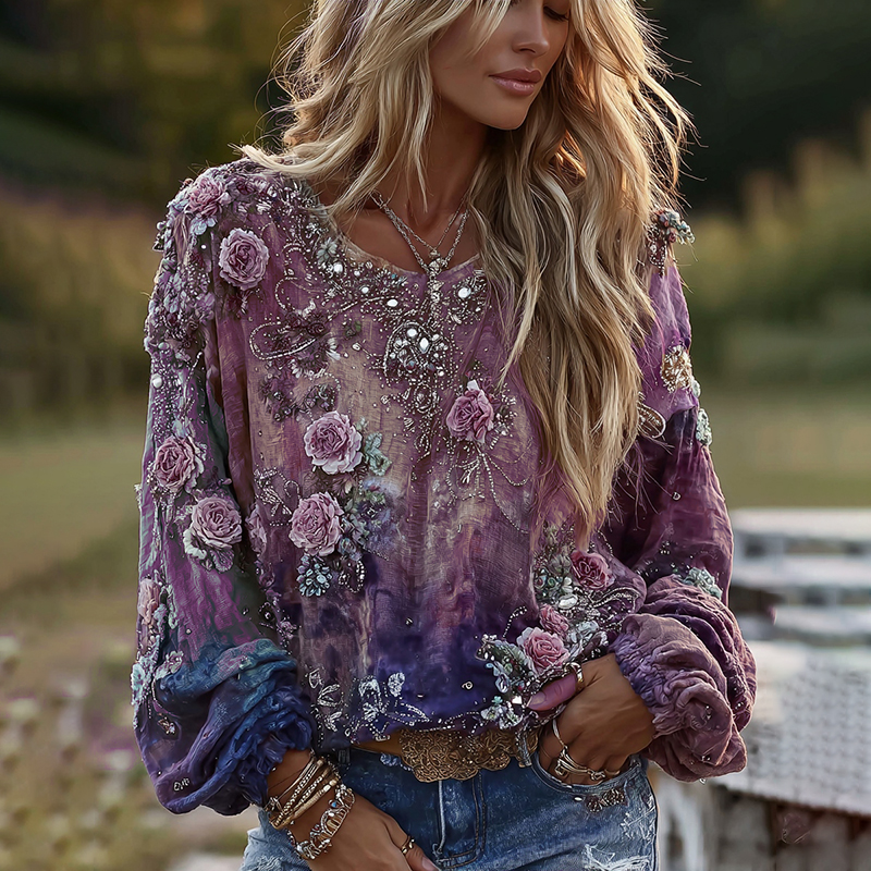 Retro Boho Rose Embroidered Sequined Long-sleeved T-shirt