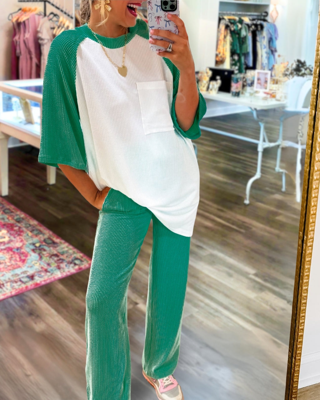 The oversized top with 3/4 sleeves and a front chest pocket pairs effortlessly with the elastic waistband pants that boast convenient side pockets for a relaxed yet chic ensemble.