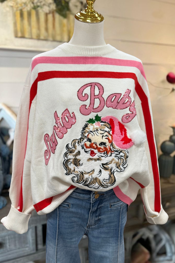 This round-neck sweater, featuring a Santa Claus baby print and sequin embellishments, creates a warm festive atmosphere. The ribbed design offers a comfortable fit, while the striped elements add a sense of fashion.