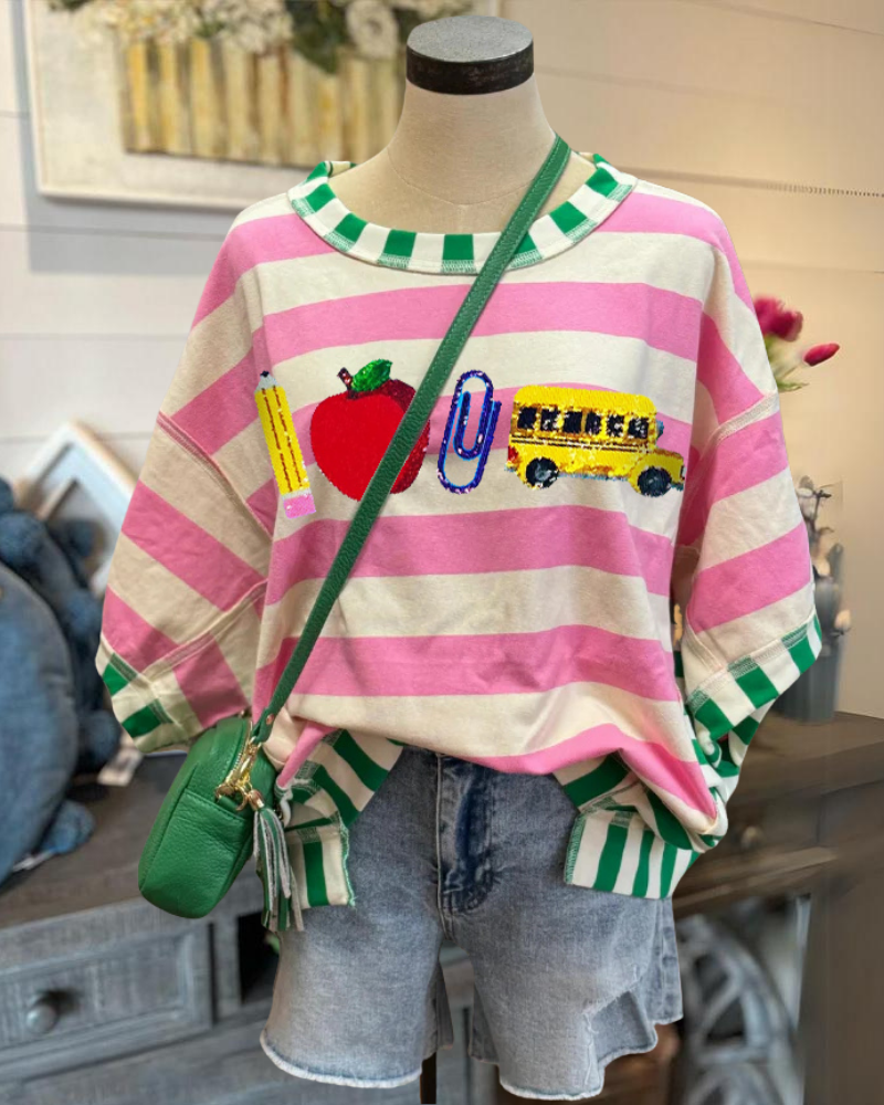 This top combines school sequins with contrasting stripe trim for a lively and comfortable crew neck.