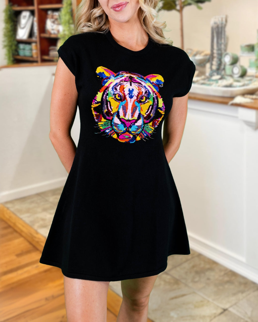 This dress is made of comfortable and soft knitted fabric, adorned with sequined tiger patterns, making it the perfect choice for showcasing personal style.