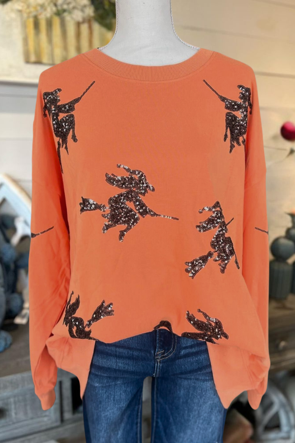 Get in the spooky spirit with our ?Sequin Sweatshirt. This orange oversized terry knit sweatshirt features a playful design of sequin witches riding a broom. Its ribbed trim adds a touch of comfort and style.