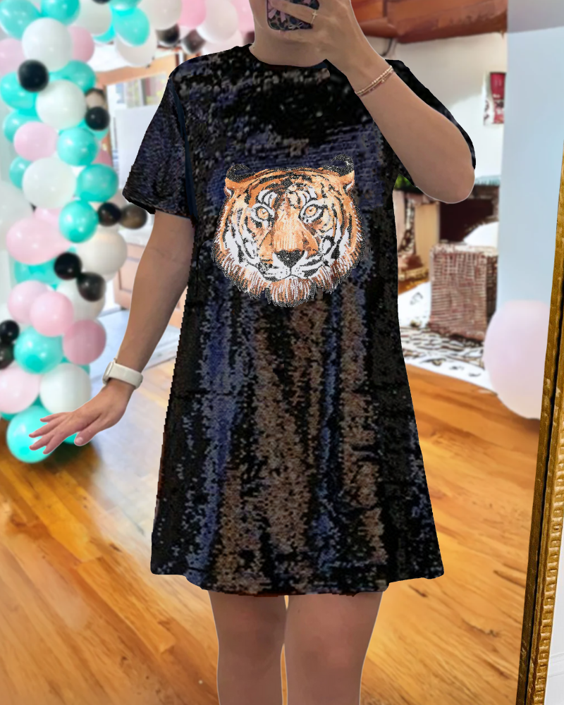 This mini dress features a dazzling tiger head crafted from shimmering sequins, making it the perfect statement piece.