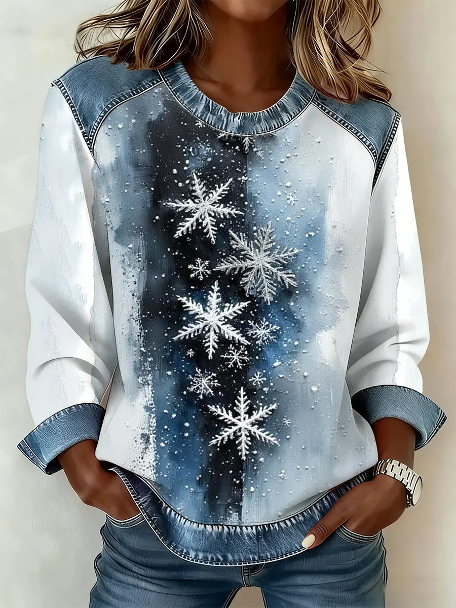 Snowflake Art Denim Patchwork Print Casual Long Sleeved Sweatshirt