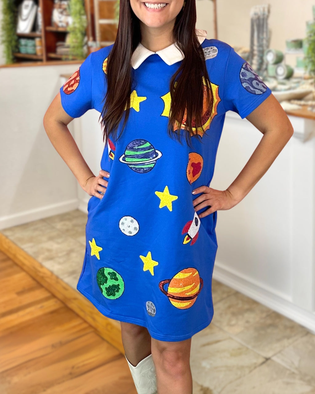 This sequined space dress is adorned with a cosmic element pattern made of sparkling sequins, which can make you shine like stars on special occasions.