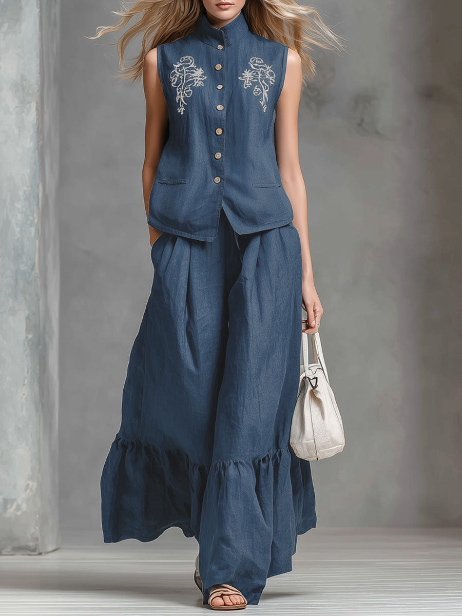 Refined yet relaxed, the Stand‑Up Collar Button Cotton‑Linen Sleeveless Embroidered Top and Pants Set combines breathable comfort with timeless elegance. The sleeveless top features a structured stand‑up collar and front button closure, delicately accented with embroidery for a touch of artisanal flair. The matching pants, cut from the same soft cotton‑linen blend, provide an easy, natural drape and a polished silhouette. Ideal for warm days or leisurely gatherings, this coordinated set pairs beautifully with woven flats or simple sandals.