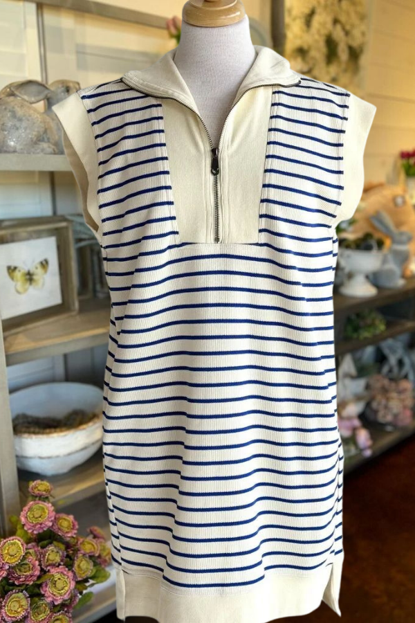 Boasting a chic stripe print and trendy cap sleeves, this dress features a stylish zipper closure at the bust for a touch of edge. The side slits and pockets add practicality and flair to the design, while the lightweight knit fabric ensures comfort all day long.