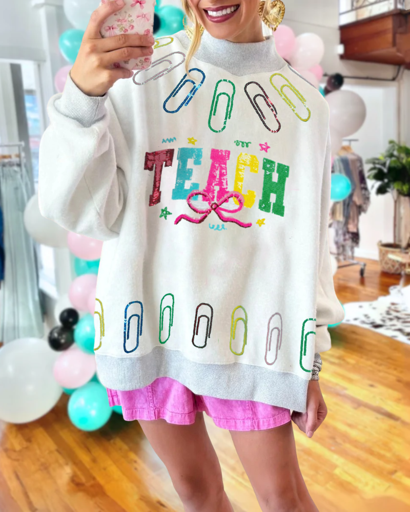 This TEACH sweatshirt features a sparkling sequined paperclip pattern. The comfortable half-high neck and relaxed fit make it a versatile choice for any casual look.