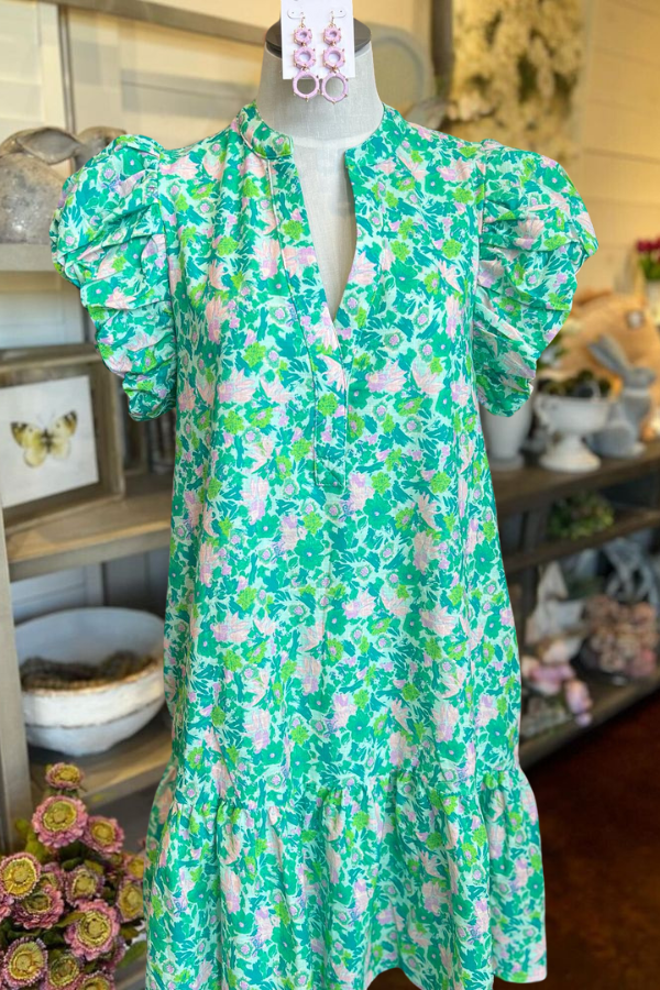 The Teal Floral Dress is a versatile addition to any wardrobe. With a beautiful green floral print and delicate puff sleeves, this dress is perfect for any summer occasion, from weddings to date nights. Its vibrant hues and elegant design make it a must-have for those who want to look their best.