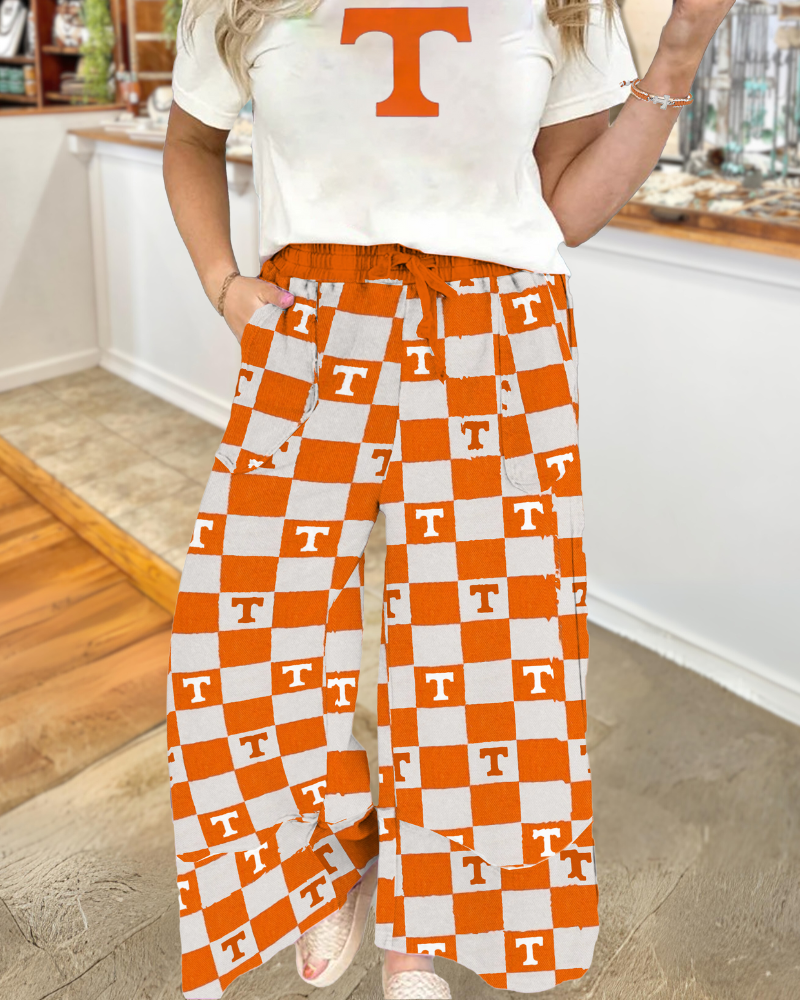 Show your team spirit with these Tennessee Plaid Wide-Leg Trousers! Featuring a bold plaid pattern inspired by classic football vibes, they combine comfort with a playful edge.