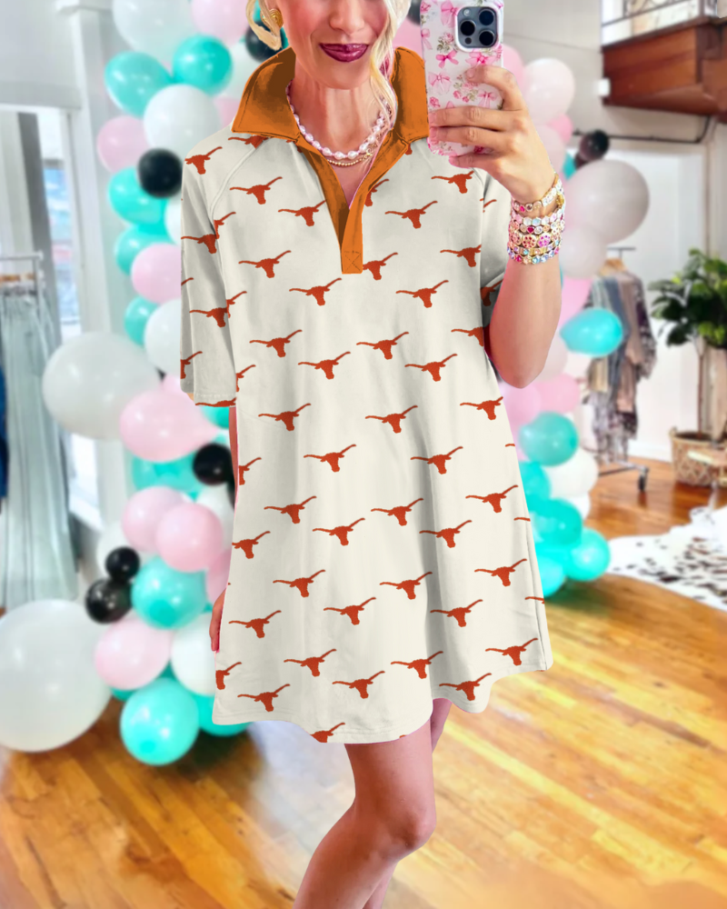 The dress features a charming half-open collar featuring the iconic University of Texas at Austin mascot for a vibrant finish.