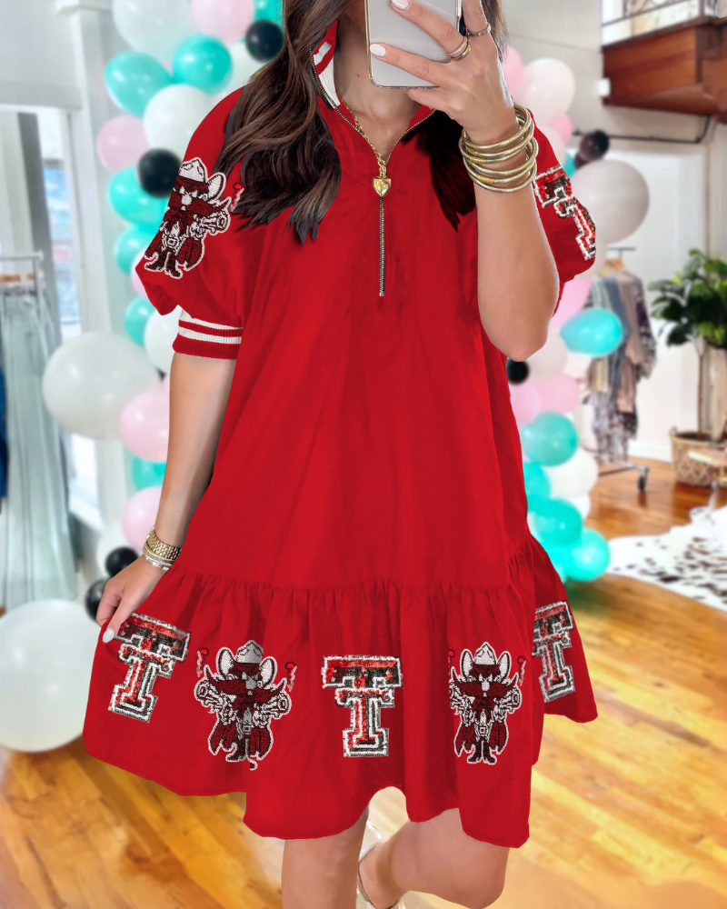 Show your Red Raiders pride with this playful Texas Tech Mascot Sequined Half-Zip Dress. Featuring shimmering sequins, a sporty half-zip collar, and eye-catching striped trim.