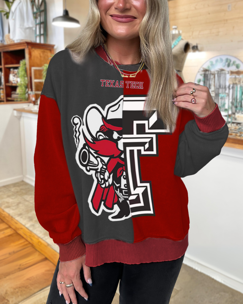 Featuring a color block design, this pullover integrates the iconic mascot and letter elements of Texas Tech. With a classic crew neck and loose fit, it balances fashion and comfort. Blending campus style with trendy design, it showcases a unique style and youthful vitality, suitable for both campus days and casual outings.