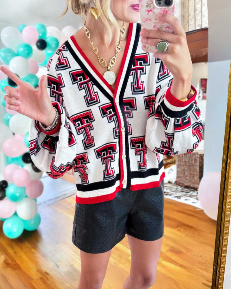 This stylish Texas Tech University Mascot Beaded Cardigan features a cozy V-neck and striped ribbed edges for a sporty vibe.