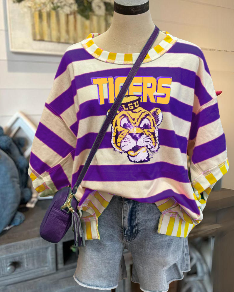 This Tigers LSU sequin striped T-shirt features a crew neck design and contrasting trims for a vibrant yet playful look.