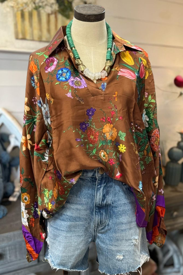 Embrace the essence of fall with this stunning Fall Floral Satin Top. Crafted from lustrous satin, it features a loose fit that exudes effortless elegance. Perfect for channeling those autumn vibes.