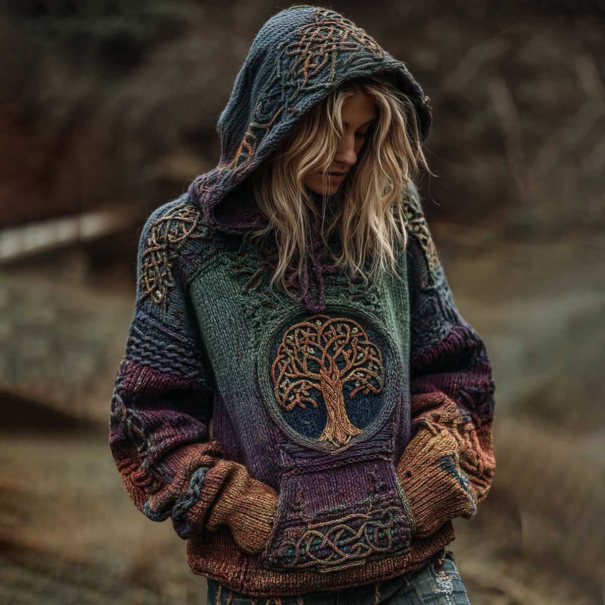 Viking Boho Life Of Tree Gradient Art Chunky Knitted Cozy Hooded Sweater