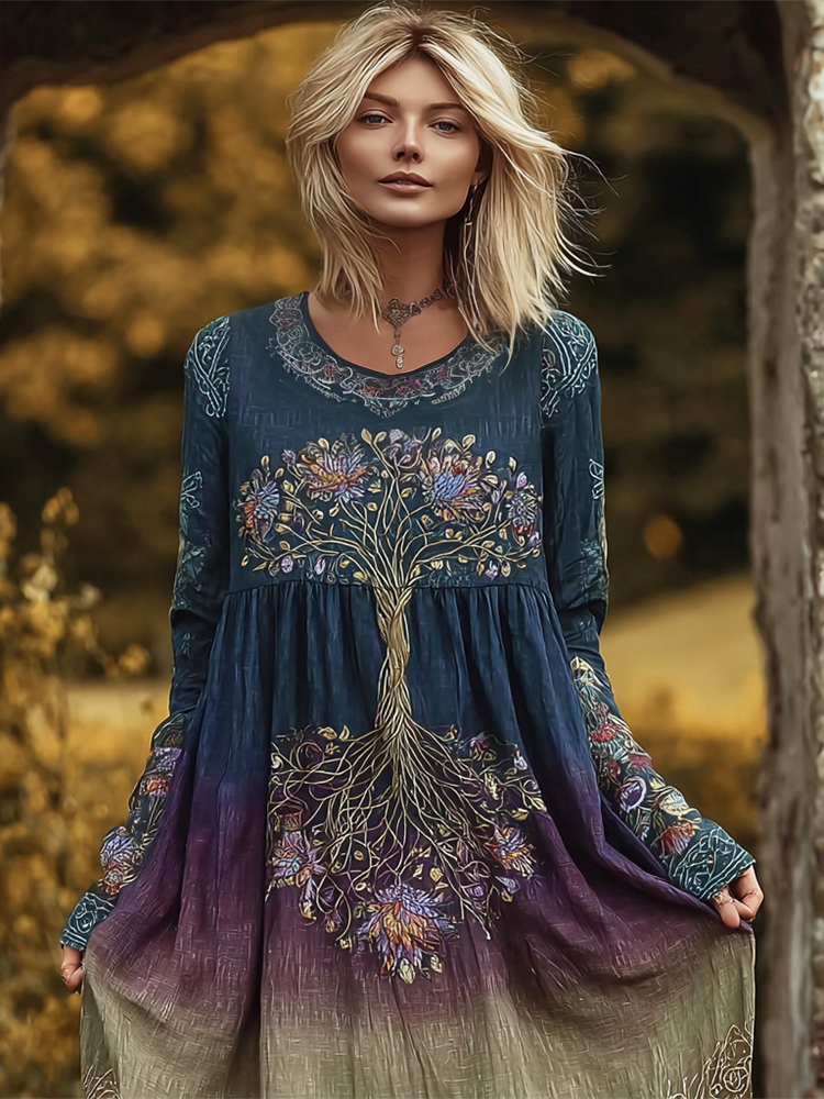 Viking Tree Of Life Embroidered Vintage Gradient Women's Linen Long Sleeve Maxi Dress