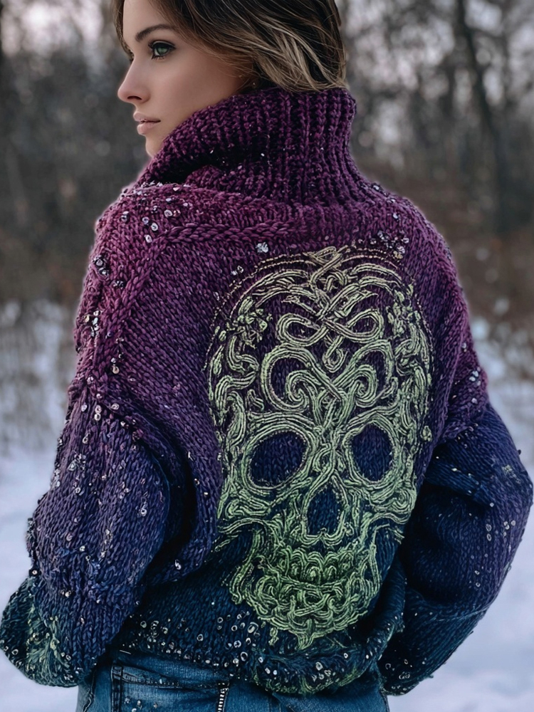 Vintage Celtic Skull Embroidered Gradient Cozy Turtleneck Sweater