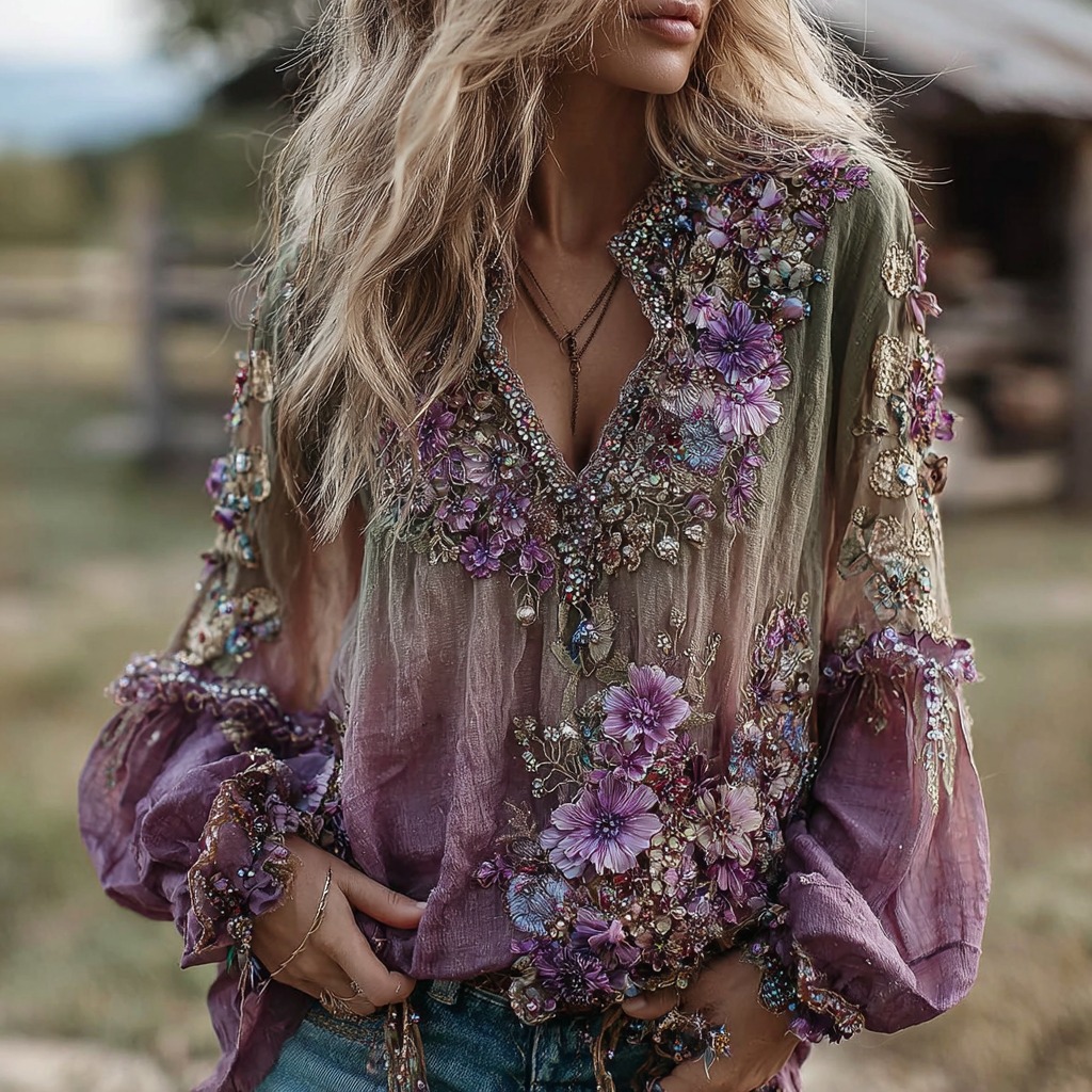 Vintage Classy Gradient Daisy Embroidered Art Linen Long Sleeve Blouse