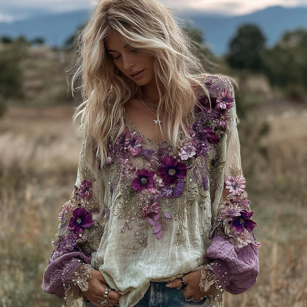 Vintage Classy Gradient Pansy Embroidered Art Linen Long Sleeve Blouse
