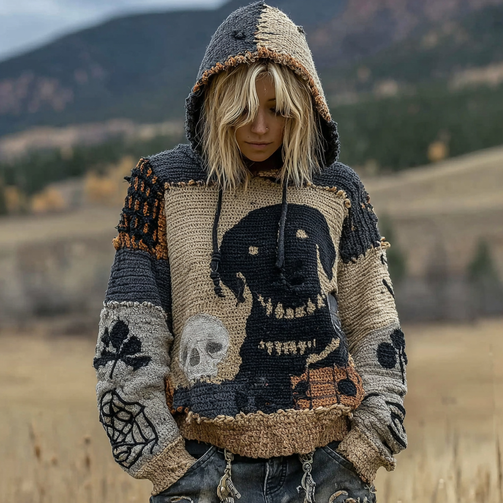 Vintage Dog Skull Spiderweb Comfy Knit Hoodie