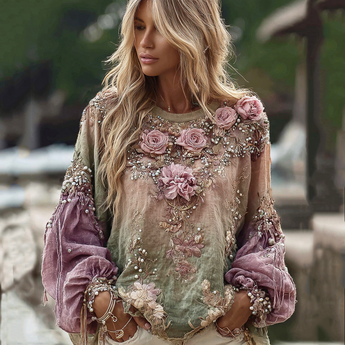 Vintage Floral Embroidery Pattern Sequined Contrast Color Long-sleeved T-shirt