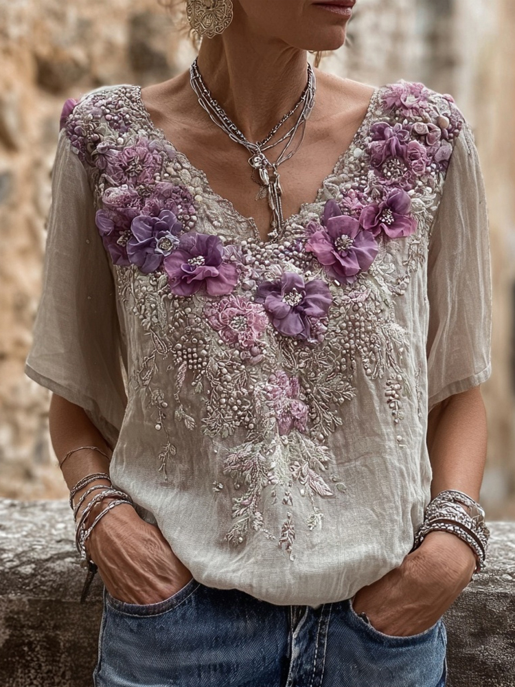 Vintage Purple Flowers Embroidered Short Sleeve Linen Shirt