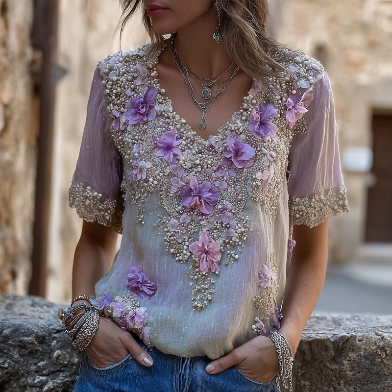 Vintage Purple Flowers Embroidered V Neck Linen Shirt