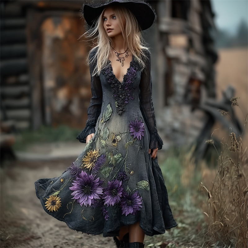 Vintage Sunflowers Lace V Neck Dyed Flowy Linen Dress