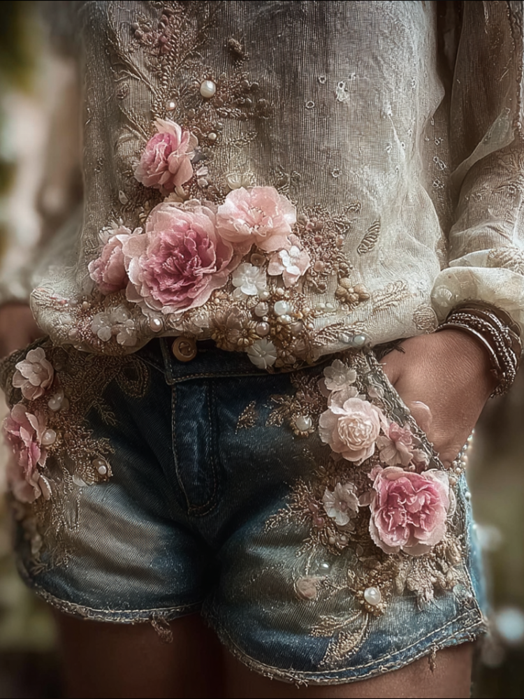 Women's Bohemian Style Three-dimensional Pink Flower Design Denim Shorts