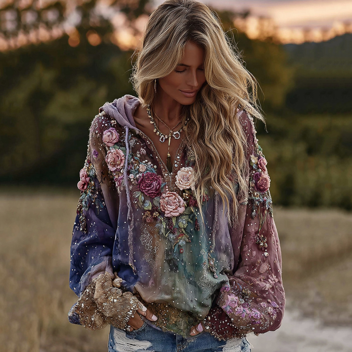 Women's Boho Tie Dye Rose Embroidered Sequined Hoodie