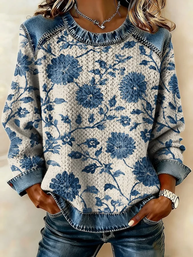 Women's casual Western-style floral color-block sweatshirt