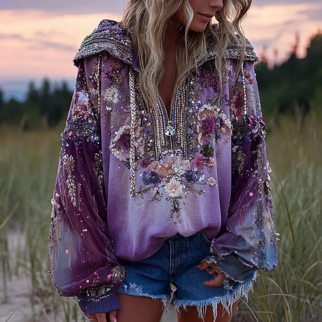 Women's Flowers Embroidered Sequined Tie Dye Hoodie