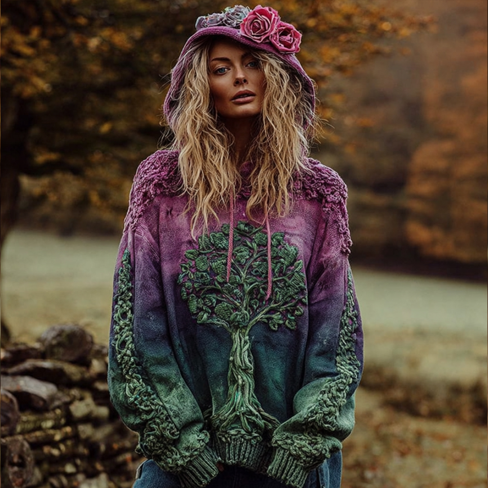 Women's Gradient Retro Tree Of Life Vintage-style Hooded Long-sleeved Sweater