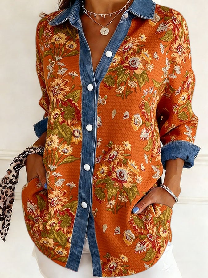 Women's Retro Floral Print Lapel Waffle Knit Shirt