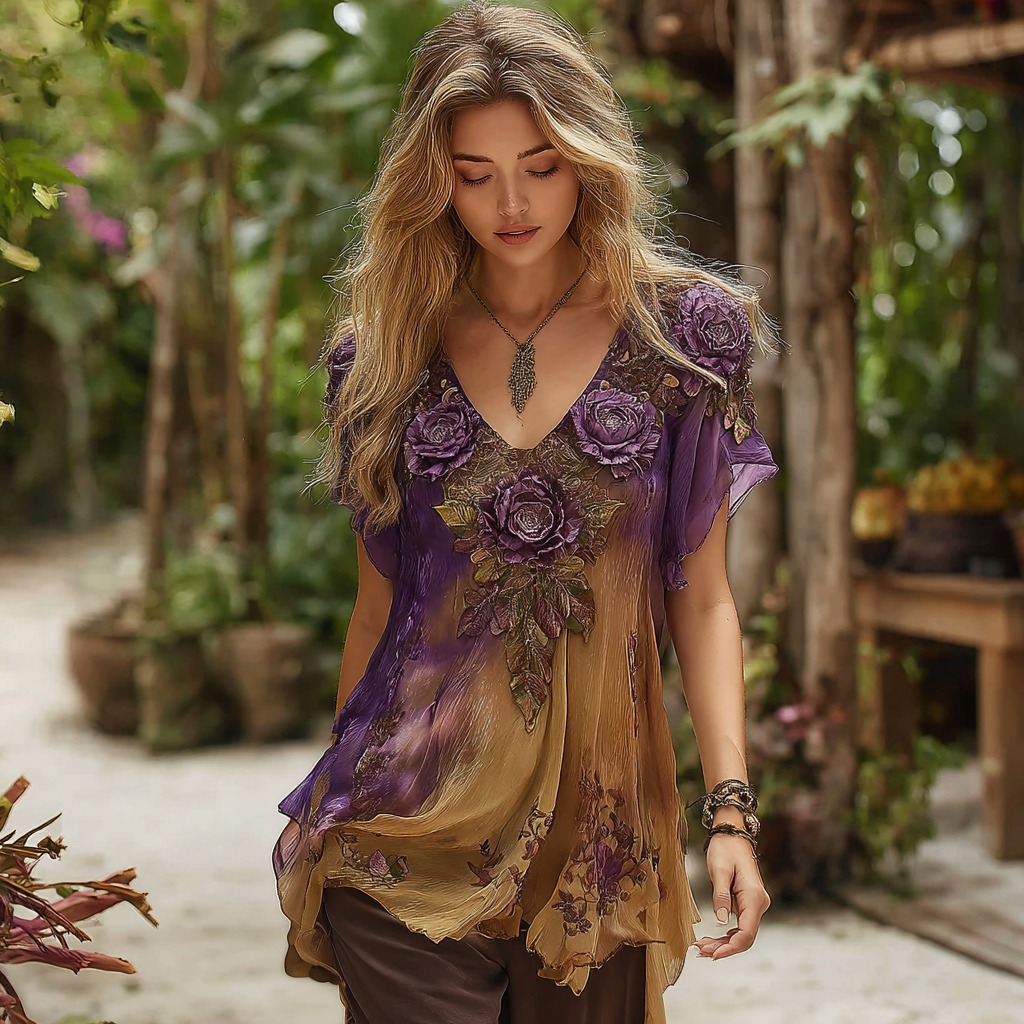 Women's Retro Purple Rose Gradient Casual V-neck T-shirt