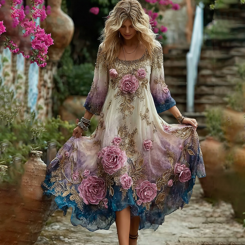 Women's Vintage Pink Floral Embroidery Gradient Art Comfy Linen Long Sleeve Maxi Dress