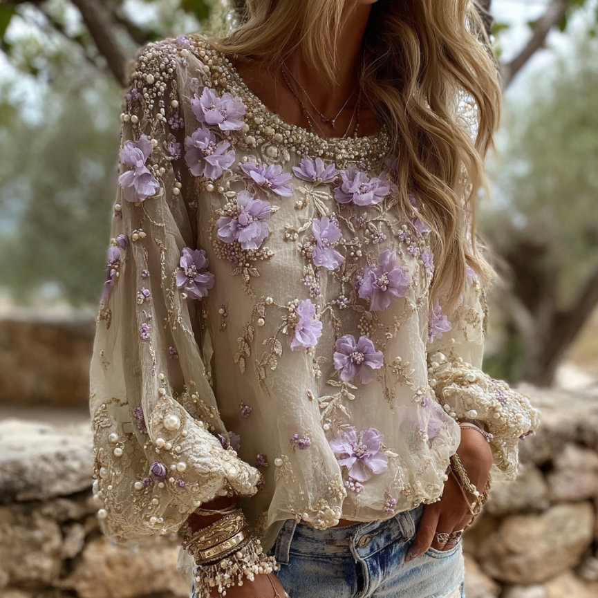 Women's Vintage Purple Flower Embroidery Art Print Round Neck Linen Blend T-shirt
