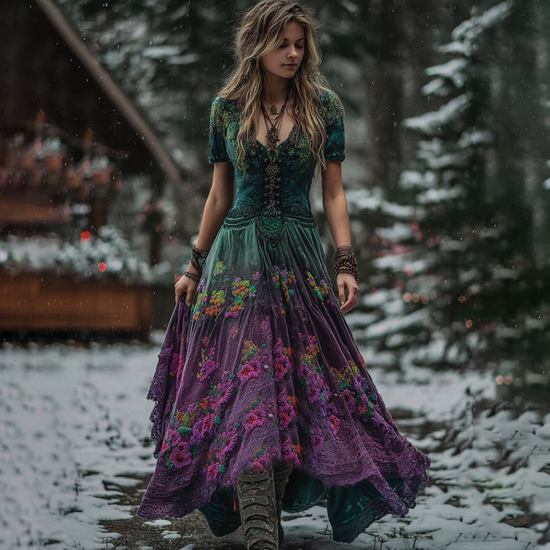 Women's Vintage Rose Gradient Art V Neck Maxi Dress